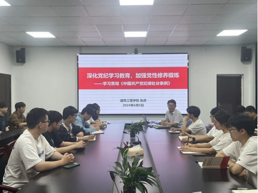 6月5日,俄罗斯专享会294地址党委书记张虎在建工北楼310会议室讲授了题为《深化党纪学习教育,加强党性修养锻炼》的党纪学习教育专题党课。学院各学生党支部党员代表参加了学习。
